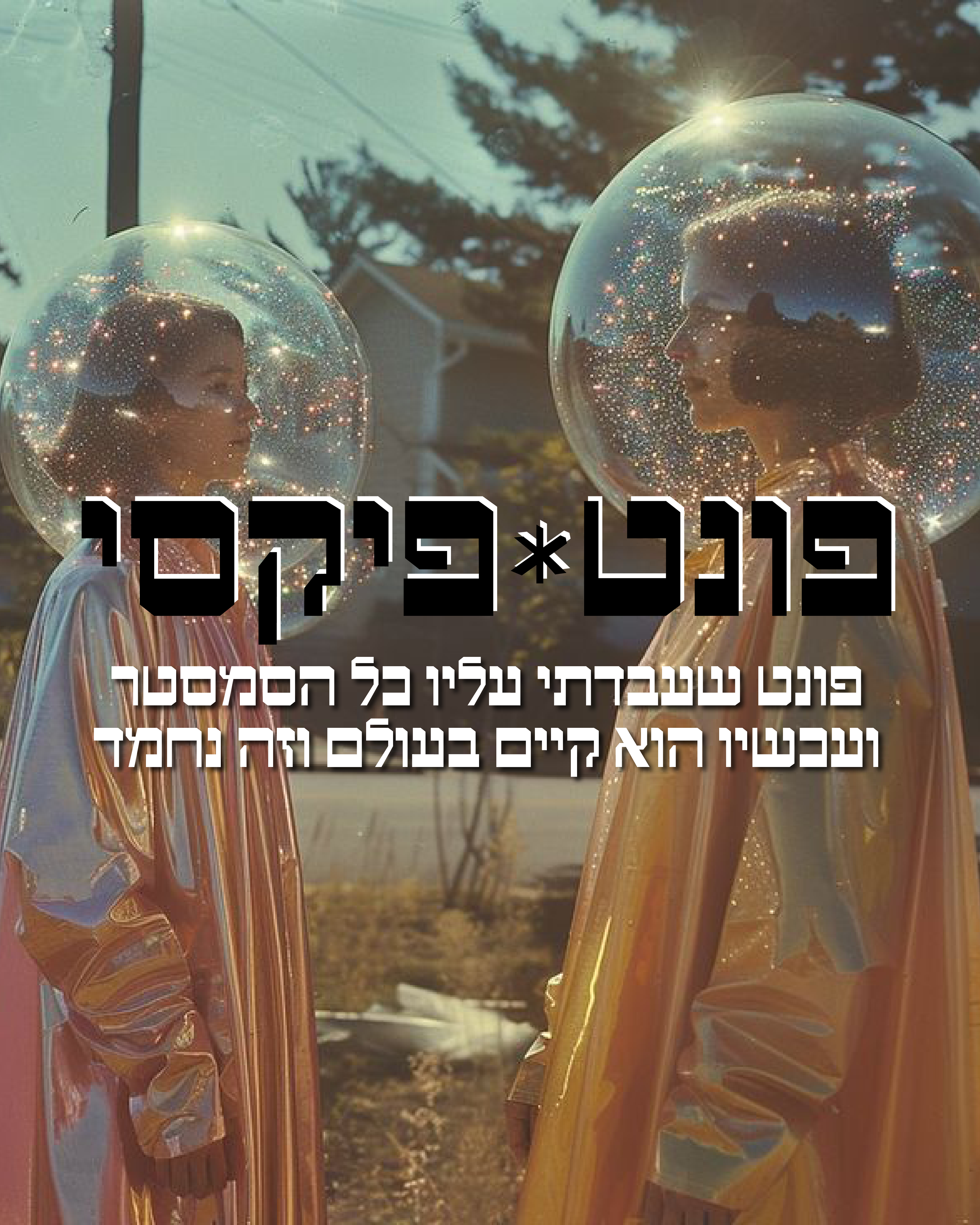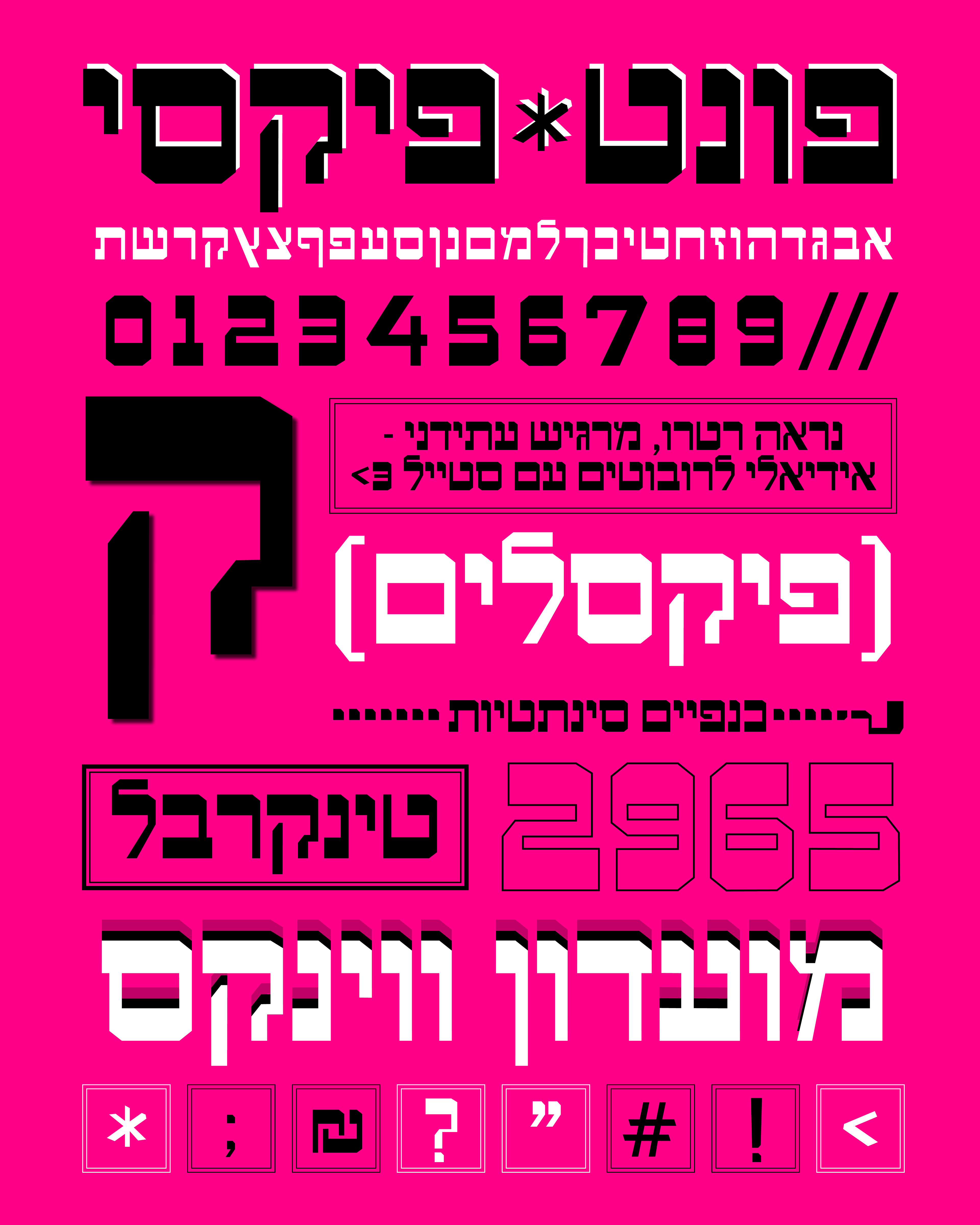Pixie is a bold, pixel-inspired Hebrew display font designed for headlines and digital projects.